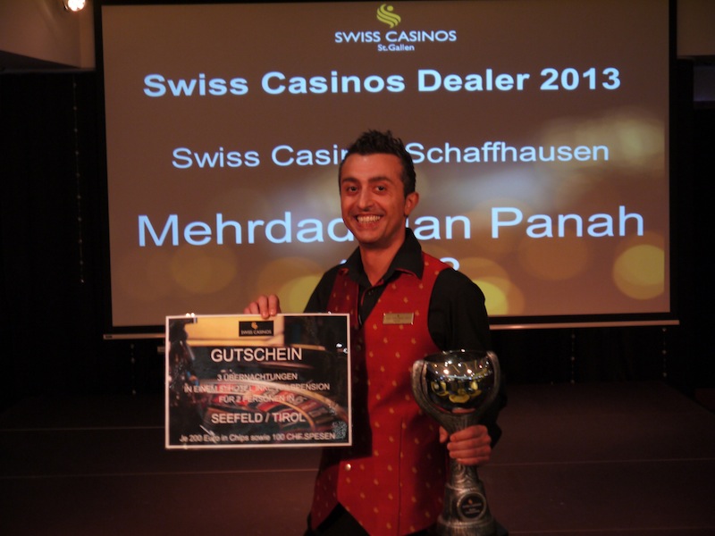 Mehrdad Jian Panah, Swiss Casinos SchaffhausenIn einem intensiven Ausscheidungsverfahren an den vier Swiss Casinos Standorten haben sich von rund 100 Croupiers über die letzten Monate am Ende sieben Finalisten für die 1. Swiss Casinos Dealer Meisterschaft qualifiziert. Das Finale fand am letzten Donnerstag, 7. November, im Swiss Casinos St. Gallen statt. Die Finalisten mussten in mehreren Wettkampfrunden ihr Können zu Spielkenntnissen beim Black Jack und Roulette, Spielkontrolle, Gästeservice, mathematisches Rechnen, Pushing Stacks und Cutting Chips unter Beweis stellen. Gesamtsieger wurde Mehrdad Jian Panah vom Swiss Casinos Schaffhausen. Jlona Vlach, Direktorin Swiss Casinos Schaffhausen, freut sich mit ihrem Team über diesen grossartigen Erfolg.