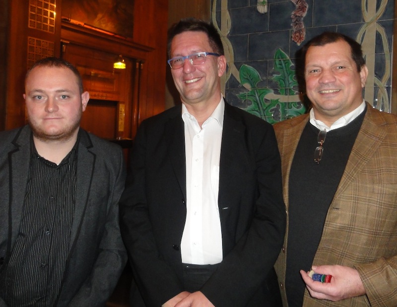 …beim Turnier am gestrigen Montag, dem ersten regulären Turnier nach der überaus erfolgreichen X-Mas Turnierwoche. Nur 48 Teilnehmer hatten das € 200 Turnier gebucht, überwiegend Pokerspieler, die auch an den Turnieren der X-Mas Woche teilgenommen hatten. Aber die, die da waren, hatten trotzdem großen Spaß an fünf Turniertischen und an einem der gestern sechs hochkarätigen Cashtables. Um kurz vor zwei Uhr morgens einigten sich die ersten Vier auf einen Pari-Deal, der neben den wertvollen Over-All-Punkten der Quartalswertung zusätzlich jedem noch knapp 1.900 Euro einbrachte.