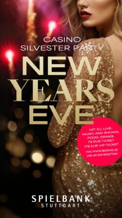 Feiern Sie die große Casino Silvester Nacht in der Spielbank Stuttgart. Ab 20 Uhr erwarten Sie ein Welcome-Drink, DJ Sounds, tolle Live Music & Shows, ein Snack, eine Mitternachtsbrezel, ein Mitternachtssekt und Glücksjetons* im Wert von 20 EUR. Zudem können Sie auch zusätzlich mit einem VIP Ticket ein Silvester Gala Menü in unserem Restaurant JOYCE den Abend genießen. Tickets können Sie online über Reservix** oder direkt bei uns im Casino an der Rezeption kaufen. VIP Tickets gehen ausschließlich über unsere Rezeption.