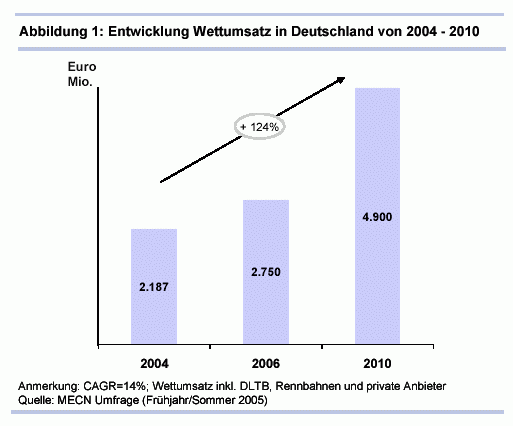 - Die deutschen Wettanbieter (staatlich sowie privat) erwirtschaften heute Wetteinsätze von geschätzten Euro 2,2 Mrd. pro Jahr und die befragten Experten schätzen, dass dieser Wettumsatz bis 2010 auf ca. Euro 5 Mrd. jährlich ansteigen wird.