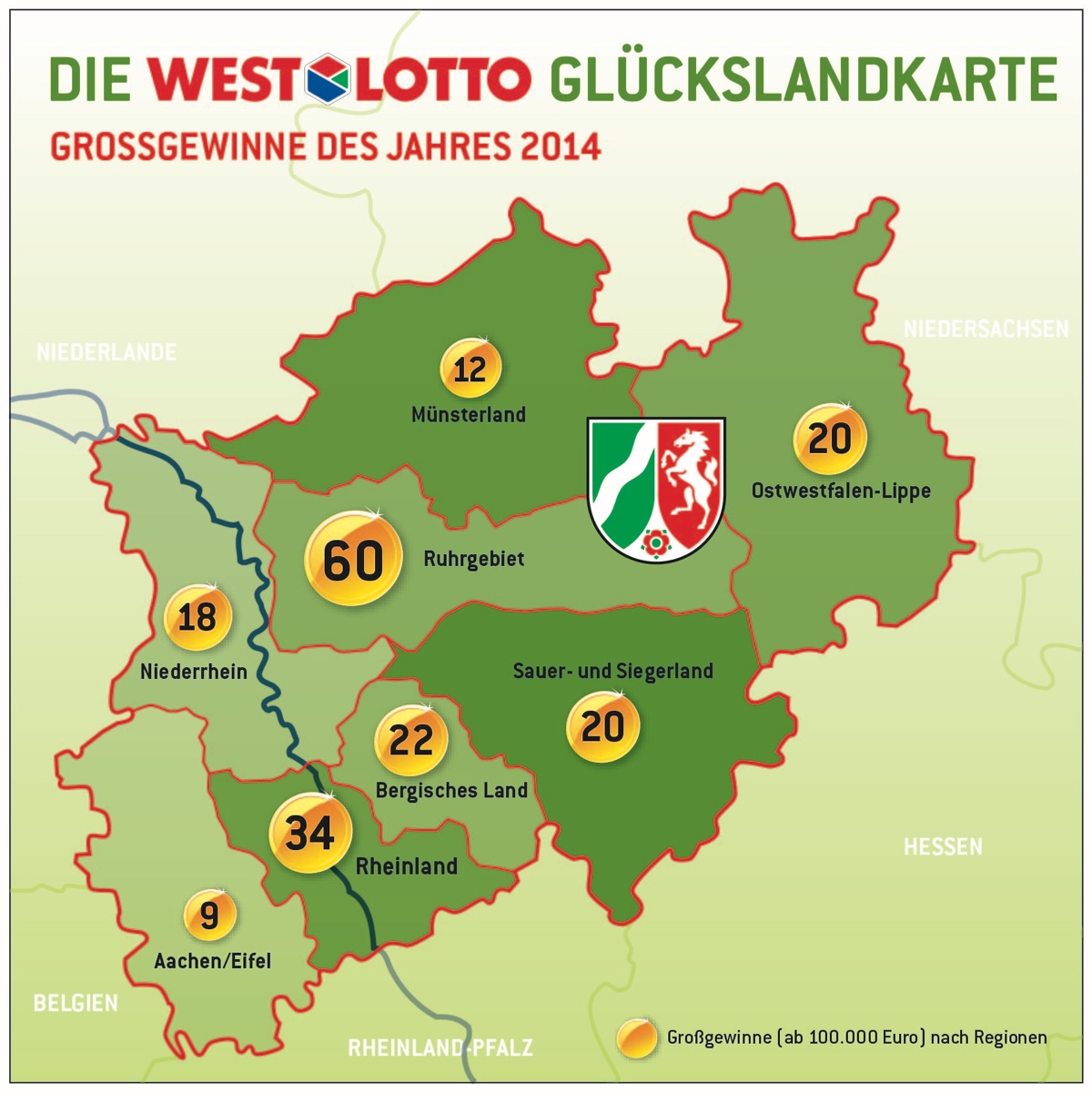 Auf dem „Siegertreppchen“ bei den Landkreisen und kreisfreien Städten steht Dortmund mit 13 Gewinnen auf Platz eins, Köln belegt mit zwölf Großgewinnern den zweiten Platz und der Kreis Mettmann kann für seine zehn Glückspilze die Bronze-Medaille beanspruchen. Oberhausen ist prozentual gesehen die wohl glücklichste Lotto-Stadt Nordrhein-Westfalens. Sie weist das beste Verhältnis von Einwohnerzahl zu Großgewinnen auf. Auf rund 24.000 Einwohner kommt dort ein Treffer ab 100.000 Euro.