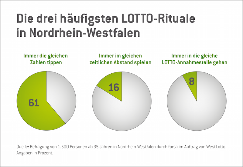 Das mit Abstand beliebteste Ritual: Die Lottospieler verlassen sich auf ihre Standardzahlen. „Das ist ein klarer Hinweis darauf, dass etliche Menschen Zahlen von Geburtsdaten, Hochzeitstagen oder den Termin vom ersten Rendezvous tippen“, erläutert Weber. 61 Prozent der befragten Lotto–Spieler sehen darin ihr Glücksritual.