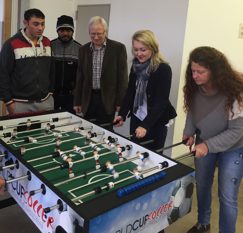 Ortsbürgermeister Erich Herbst freute sich über die neue Freizeitbeschäftigung für die kleinen und großen Bewohner der Aufnahmeeinrichtung und bedankte sich bei Olga Sawatzky. Die Gebietsleiterin ist auch für die Spielstation Heiligenroth verantwortlich und bei einem Gespräch fragte vor kurzer Zeit der Ortsbürgermeister nach, ob die Schmidt Gruppe einen Kicker spenden könnte.