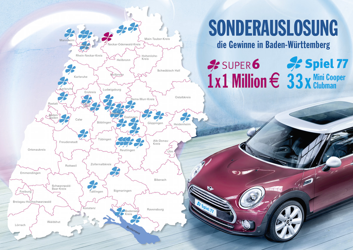Zu diesem Überraschungsgewinn von einer Million Euro kam der Tipper aus dem nördlichen Baden-Württemberg durch die landesweite Sonderauslosung von Lotto-Baden-Württemberg. Er hat an der Zusatzlotterie Super 6 teilgenommen. Üblicherweise liegt der Maximalgewinn bei der Zusatzlotterie Super 6 bei 100.000 Euro. Weitere 33 Glückspilze dürfen sich über ein neues Auto freuen. Ihre Teilnahme am Spiel 77 beschert ihnen nun einen Mini Cooper Clubman.