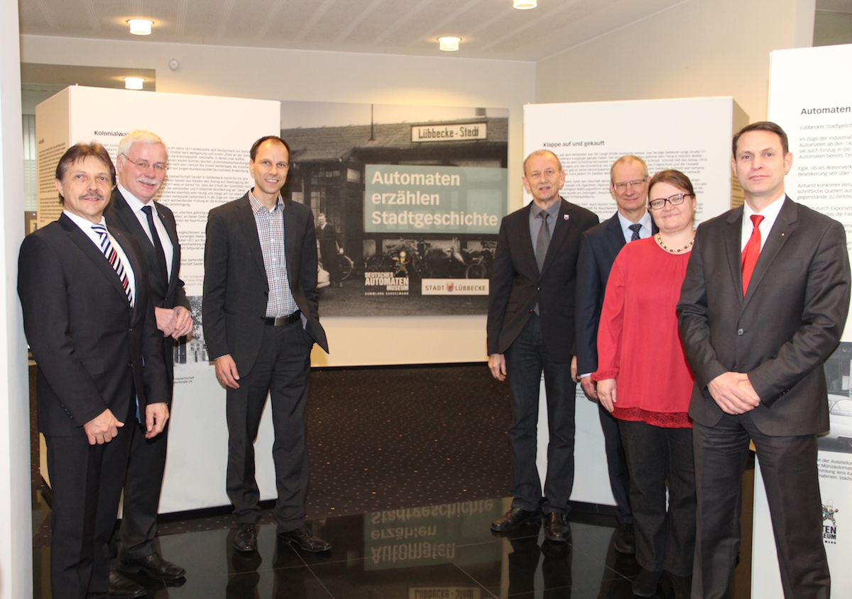 Eröffneten gemeinsam die Ausstellung in der Sparkasse Minden-Lübbecke in Lübbecke. V.l.n.r: Jürgen Vieker, Marktbereichsleiter der Sparkasse Minden-Lübbecke, Georg Droste, stellvertretender Vorstandsvorsitzender der Sparkasse Minden-Lübbecke, Sascha Wömpener, Leiter des Deutschen Automatenmuseums – Sammlung Gauselmann, Karl-Friedrich Rahe, stellvertretender Bürgermeister der Stadt Lübbecke, Uwe Feldmann, Stadtführer der Stadt Lübbecke, Christel Droste, Leiterin des Archivs und Museums der Stadt Lübbecke und Marc Schäuble, Geschäftsstellenleiter der Sparkasse Minden- Lübbecke in Lübbecke.