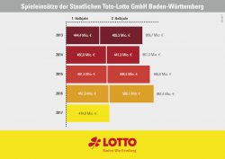 Die Staatliche Toto-Lotto GmbH schüttete im ersten Halbjahr 235 Millionen Euro an die Spielteilnehmer in Baden-Württemberg aus. Für das Land erzielte das Glücksspielunternehmen rund 183 Millionen Euro. Der Betrag setzt sich zusammen aus rund 79,4 Millionen Euro Lotteriesteuer und rund 103,4 Millionen Euro an Zweckerträgen. Über den Wettmittelfonds des Landes werden aus den Zweckerträgen der Sport, Kunst und Kultur, Denkmalpflege und der Sozialbereich in Baden-Württemberg gefördert – im Gesamtjahr 2017 mit 132,4 Millionen Euro.