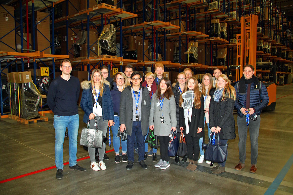 Lars Langenberg führte die Gruppe durch die Logistik der Gauselmann Gruppe, V.l.n.r.: Lars Langenberg, Juliane Engelking, Judith Möhlmann, Josephine Elsing (Personal Team), Andreas Hillebrand, Mark Becker, Theresa Rollmann (Personal Team), Lucas Pichner, Maria Warkentin, Nele Ahrensmeier, Steffen Arning, Angelika Schartner, Polina Schönfeld, Karina Hubricht, Svenja Kramer, Kai-Frederick Engel.