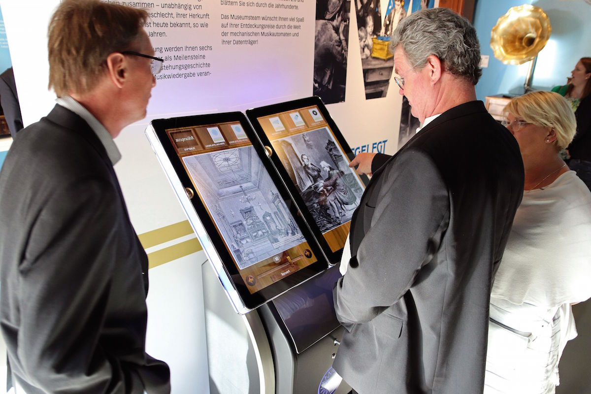 Neu an dieser inzwischen 4. Sonderausstellung des Deutschen Automatenmuseums ist jedoch nicht nur das Thema, sondern auch die komplette Optik des Raums. Darüber hinaus wurden insgesamt sechs Hörstationen installiert, an denen die Geschichte der Erfinder und ihrer Innovationen erzählt wird. Überdies steht ein überdimensional großes, aufgeschlagenes Buch für die Museumsbesucher bereit, in dem ausführliche Details über die einzelnen Exponate per Touchscreen-Bedienung ‚nachgeschlagen‘ werden können. In der Sonderausstellung sind somit Geschichte und Hightech gelungen miteinander kombiniert worden.
