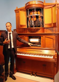 Zu den besonders eindrucksvollen mechanischen Musikinstrumenten gehört in diesem Kontext zweifelsohne das Geigen-Piano „Hupfelds Phonoliszt-Violina“. Der kreisförmige Geigenbogen ist mit Rosshaar bespannt. Die Geige wird je nach Bedarf durch ein fein reguliertes, pneumatisches System schwächer oder stärker gegen den rotierenden Geigenbogen gedrückt. Kleine, gummistoffbezogene Bälgen betätigen Finger, die auf der Geigensaite die entsprechenden Töne abgreifen. „Von enthusiastischen Bewunderern wurde die Phonoliszt-Violina auch als das 8. Weltwunder bezeichnet“, weiß Sascha Wömpener zu berichten.
