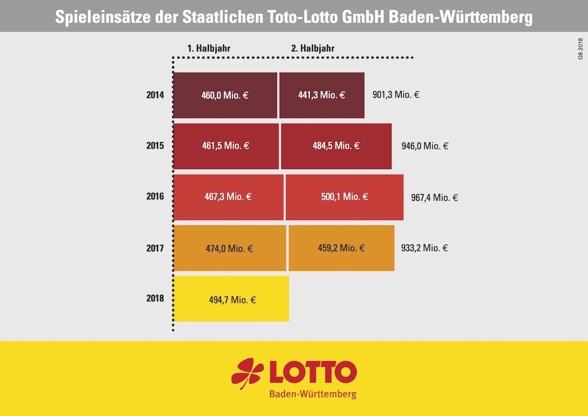Von Januar bis Ende Juni setzten die Baden-Württemberger beim Landesunternehmen 494,7 Millionen Euro ein. Das ist ein Zuwachs von 20,7 Millionen Euro bzw. 4,4 Prozent gegenüber dem ersten Halbjahr 2017. Wesentlich zum Ergebnis trug die europäische Lotterie Eurojackpot bei. Das Kernprodukt Lotto 6aus49 verzeichnete dagegen deutliche Einbußen.