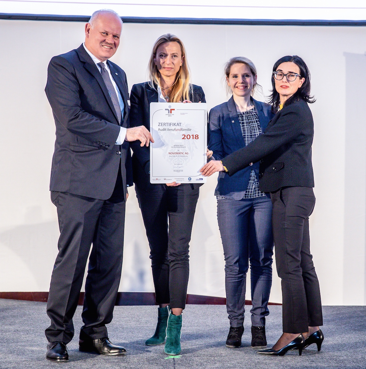 NOVOMATIC erhält Vollzertifikat des „Audit berufundfamilie“ durch das Bundesministerium für Frauen, Familien und Jugend in der Aula der Wissenschaften in Wien.