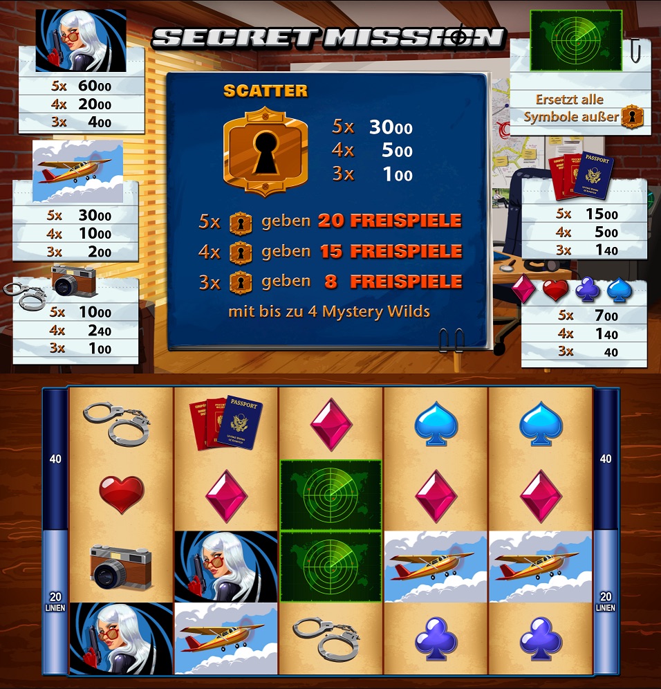 Secret Mission ist ein klassisches 5 Walzen Spiel mit 20 oder 40 Linien, das mit liebevoll umgesetzten Animationen und spannendem Sound im Stil von Agentenfilmen für viel Unterhaltung sorgt.