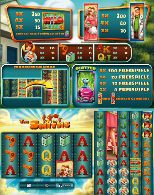 Das Abenteuer beginnt! Eine in der Vorstadt lebende Familie (Vater, Mutter, Tochter und Hund) ist bei drohender Gefahr sofort zur Stelle und bekämpft als Superhelden das Böse. Das bunte, spannende BALLY WULFF Spiel The Smiths erstreckt sich über gleich 2 Walzenkörper – einer mit 5 Walzen und je drei Symbolfeldern, der andere mit 5 Walzen und sogar je 9 Symbolfeldern – Gespielt werden kann auf 20, 40, oder 60 Linien.