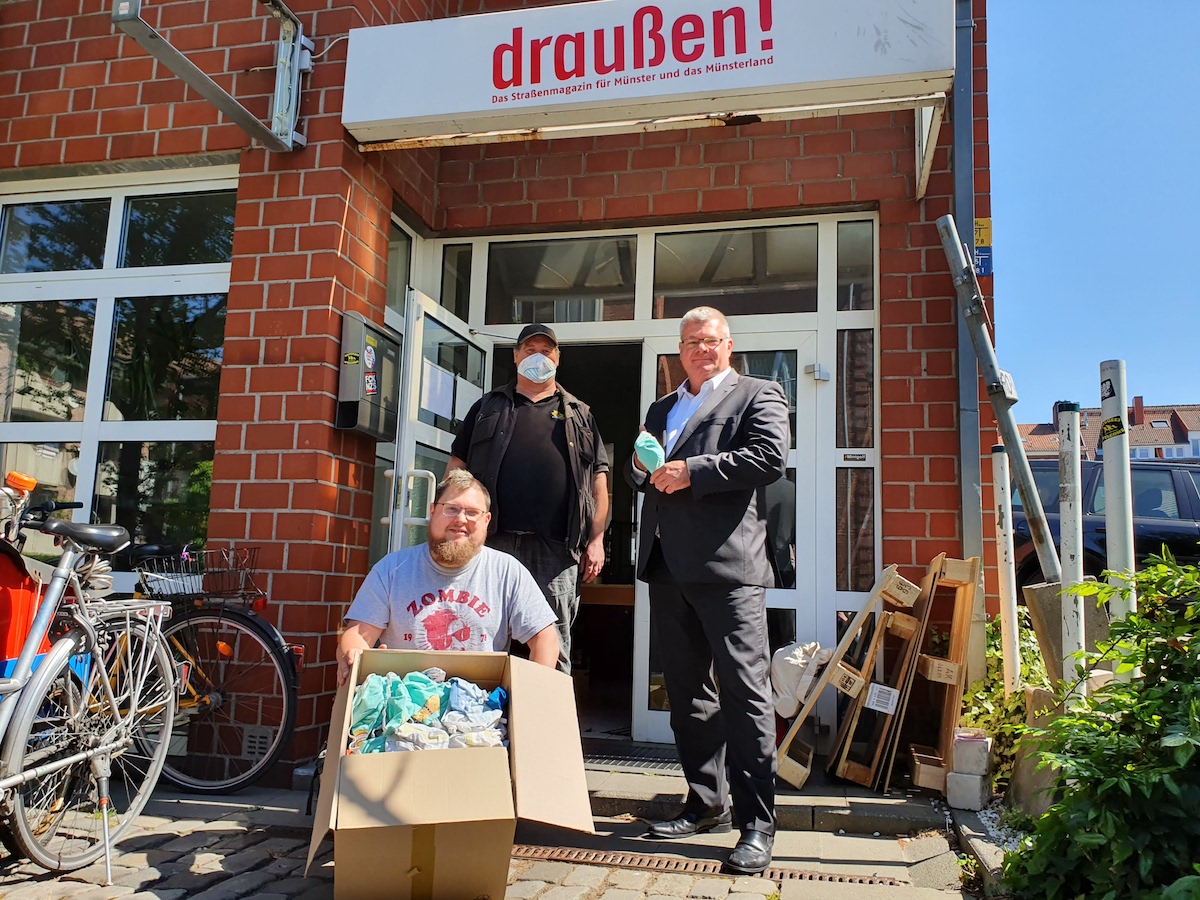 Sozialarbeiter Niklas Brandt vom Verein draußen e.V. (vorne links) und draußen!-Verkäufer Detlef Brocks (hinten links) nehmen die Stoffmasken-Spende von WestLotto-Sprecher Axel Weber (rechts) entgegen.