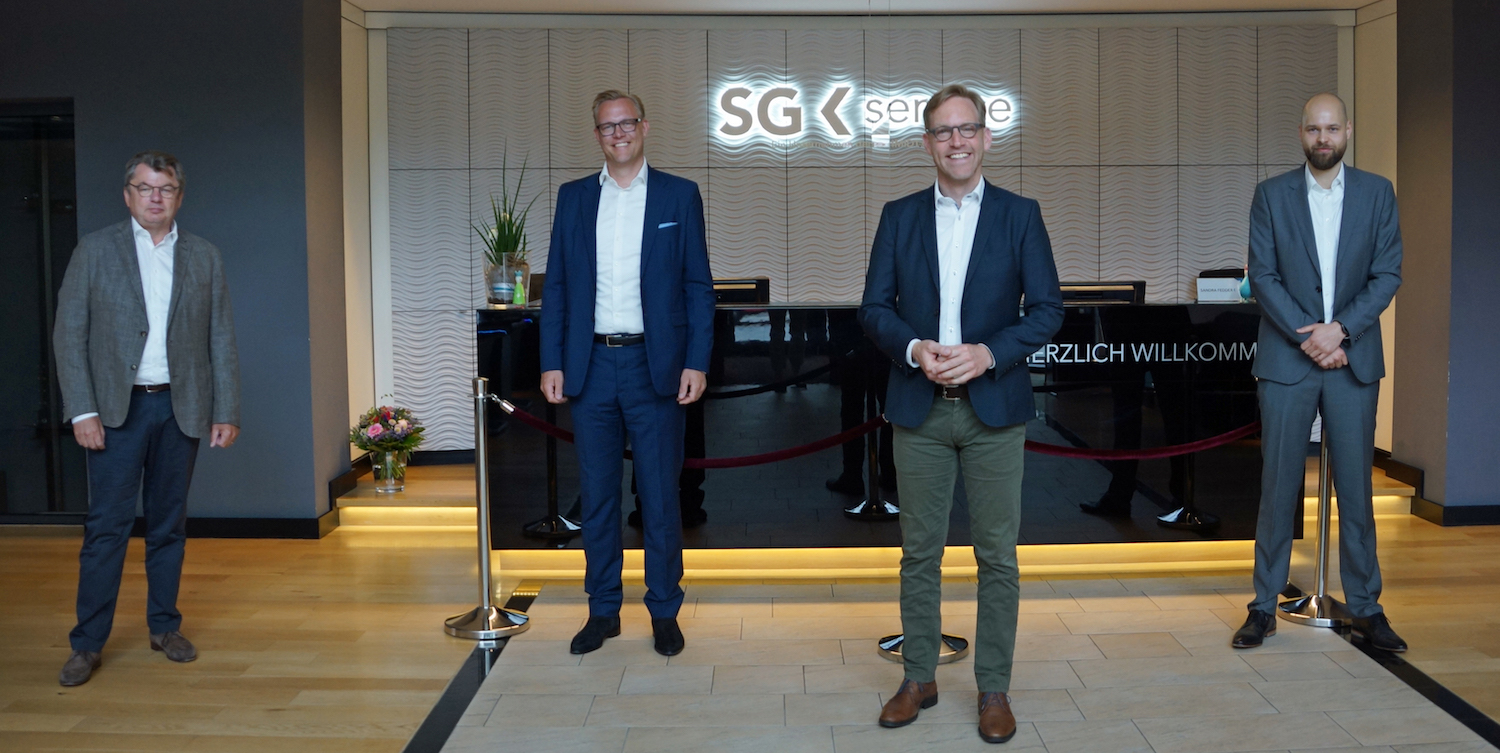 Gemeinsam mit den beiden Geschäftsführern und Gesellschaftern der SCHMIDT.GRUPPE, Arne Schmidt und Axel Schmidt, begrüßten Stefanie Klönne (Leitung Kommunikation) und Nico Pilot (Stellv. Leiter Politik und Grundsatzfragen) den Bundestagsabgeordneten Marc Henrichmann aus dem heimischen Wahlkreis (Coesfeld-Steinfurt II) bei der SG Service Zentral GmbH in Coesfeld. Der CDU-Politiker besuchte auf Einladung der SCHMIDT.GRUPPE das Unternehmen zum ersten Mal. Marc Henrichmann informierte sich aus erster Hand über die Geschichte und die Geschäftsfelder der Unternehmensgruppe. Zudem interessierte er sich besonders für die aktuelle Situation und den Umgang der SCHMIDT.GRUPPE mit dem Corona-Virus sowie für die Konzepte zum kontaktlosen und hygienischen Betrieb in Freizeiteinrichtungen und Fitnessstudios.