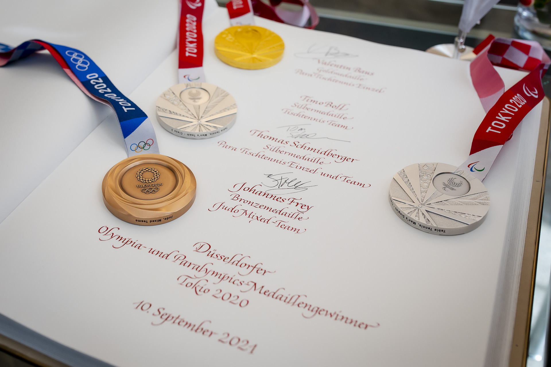 Die Medaillengewinner des TEAM 2021 Düsseldorf trugen sich in das Goldene Buch der Stadt Düsseldorf ein.