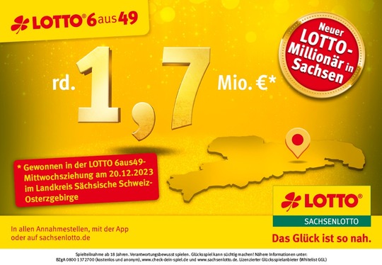 Zu Weihnachten gibt es Geschenke und Überraschungen – auch bei Sachsenlotto. Nachdem die Nikolaus-Sonderauslosung bereits einen Millionengewinn in den Freistaat gebracht hat, gibt es nach der Mittwochsziehung am 20. Dezember den nächsten Sachsenlotto-Millionär. Der Gewinner hat seinen Lottoschein in einer Sachsenlotto-Annahmestelle im Landkreis Sächsische Schweiz-Osterzgebirge abgegeben und auf das Systemspiel gesetzt. Er hat neun Zahlen in seinem System-Tippfeld angekreuzt, durch die Kombination der ausgewählten Zahlen hat er damit 84 Tipps gespielt. Er hat zusätzlich zu den „6 Richtigen“ auch 18mal „5 Richtige“, 45mal „4 Richtige“ und 20mal „3 Richtige“ gewonnen.