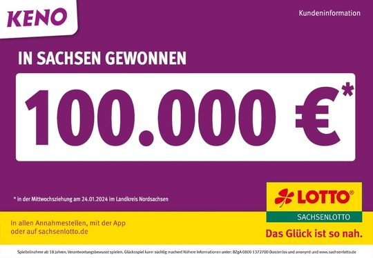 … ist ein KENO-Spieler aus dem Landkreis Nordsachsen. Mit seiner Spielteilnahme und einem Einsatz von 17,75 Euro landete er mit den Zahlen 9, 19, 37, 38, 43, 45, 48, 57, 59, 67 einen Treffer im KENO-Typ 10. Der Glückspilz kann ganz entspannt auf seine Gewinnüberweisung warten. KENO wird nämlich mit der Kundenkarte gespielt. Damit kann Sachsenlotto seinen Gewinn aus der KENO-Ziehung vom Mittwoch, dem 24. Januar 2024, direkt und ohne sein Zutun überweisen.