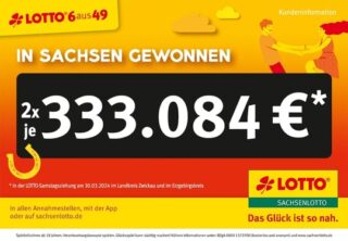 Über die gleichen „6 Richtigen“ direkt im ersten von fünf Spielfeldern kann sich ein Lotto-Spieler aus dem Erzgebirgskreis freuen. Auch er gewann damit in der Samstagsziehung 333.084 Euro in Gewinnklasse 2. Seinen Lottoschein löste er bereits am 19. März mit einem Einsatz von 49,75 Euro für insgesamt fünf Samstagsziehungen inklusive der Zusatzlotterien SUPER 6 und Spiel 77. Sein Schein ist somit noch drei Wochenenden im Rennen und hat weiterhin die Chance auf große Gewinne.