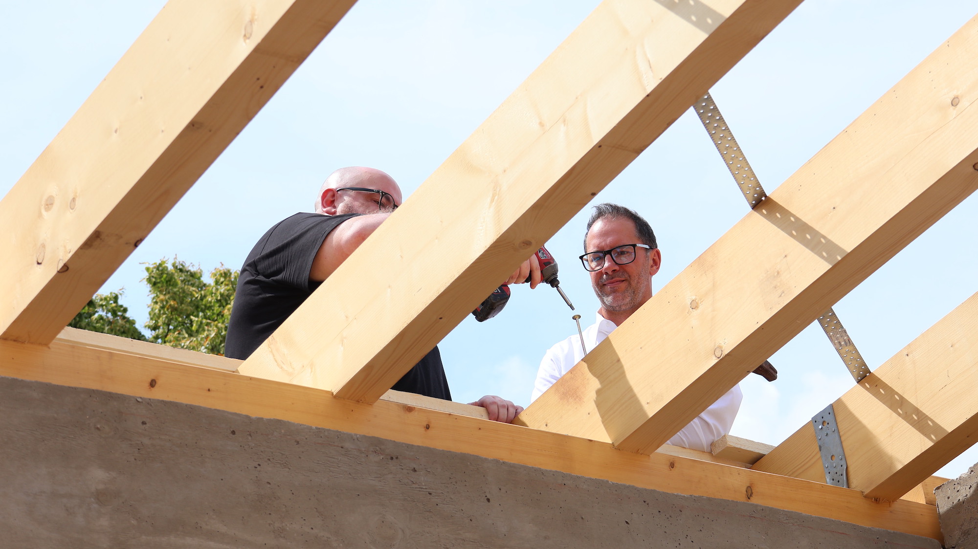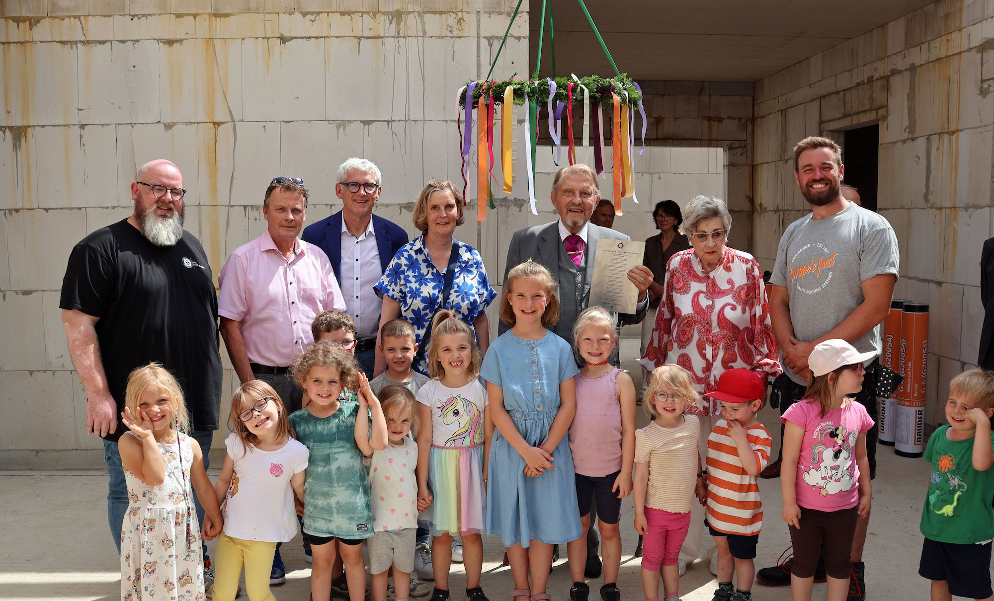 „Meine Frau und ich freuen uns, dass wir etwas Gutes für unsere gemeinsame Heimat Gestringen bewirken können“, erklärte Paul Gauselmann. „Die neue Kita wird eine echte Bereicherung. Toll, dass die Arbeiten so schnell vorankommen.“ Die Kosten für den Neubau liegen bei rund 2,6 Millionen Euro und werden vom Unternehmerehepaar über die Paul und Karin Gauselmann-Stiftung finanziert. Dem Gestringer gebührte deshalb auch die Ehre, den Richtkranz auszurichten. Dieser wurde von Manuel Wiens, vom gleichnamigen Betrieb aus Espelkamp, befestigt. Der Dachdecker und Zimmerermeister bedankte sich beim Unternehmerehepaar für das außerordentliche Engagement und verkündete anschließend den traditionellen Richtspruch. Doch das war nicht der einzige symbolische Akt: Kita-Leiter Christian Albrecht und Lars Reichel, Geschäftsführer des Immobilienbereichs der Merkur Group, begaben sich anschließend ebenfalls aufs Dach und drehten die letzte Schraube in den Holzbalken.