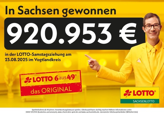 Einmal alle Zahlen richtig – und plötzlich steht das Leben auf neuen Füßen. Mit sechs Richtigen bei LOTTO 6aus49 hat ein Lottospieler aus dem Vogtlandkreis bei der Ziehung am Samstag, dem 23. August, 920.953 Euro gewonnen.