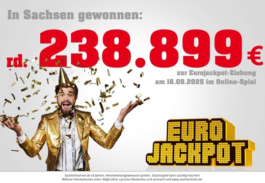 Ein Eurojackpot-Spieler aus Sachsen hat seinen Spielschein noch am Dienstag, dem 16. September 2025 abgegeben – und dabei einen Volltreffer gelandet. Mit den fünf richtigen Gewinnzahlen im siebten Spielfeld sicherte er sich 238.898,60 Euro in der Gewinnklasse 3. Da der Gewinn über das Online-Spiel erzielt wurde, kann er dem Spieler automatisch zugeordnet und bequem überwiesen werden.