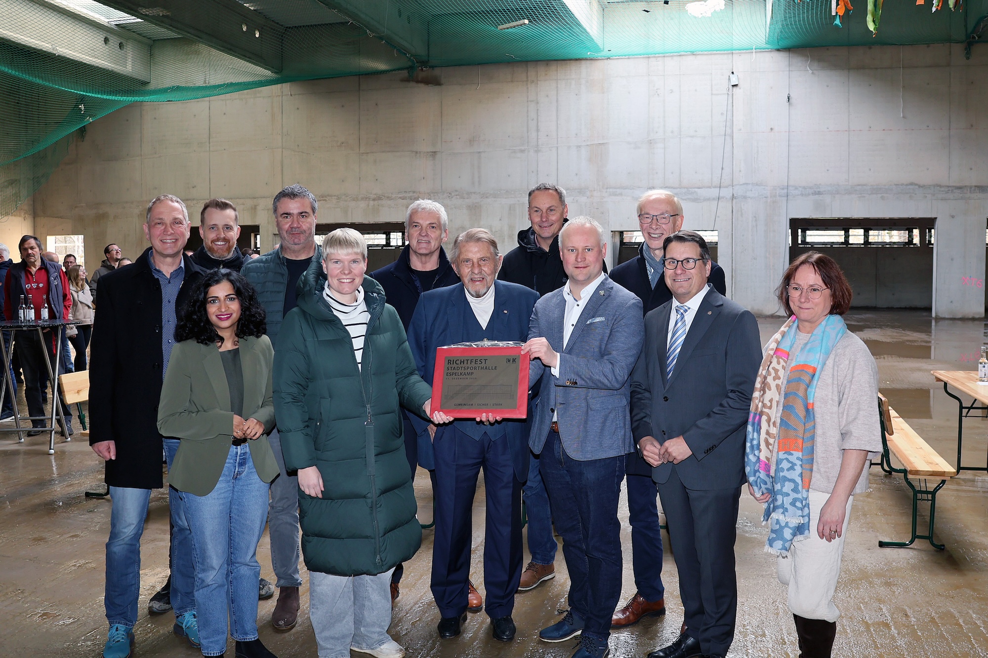 Espelkamp - Für alle Sportbegeisterten war es ein großer Augenblick: Das Richtfest für die neue Stadtsporthalle in Espelkamp konnte gefeiert werden. Im Mittelpunkt stand vor allem Paul Gauselmann. Mit seiner Spende über 2,25 Millionen Euro hatte Espelkamps Ehrenbürger wieder einmal Verantwortung übernommen und den entscheidenden Beitrag dazu geleistet, dass die neue Sportstätte realisiert werden kann. So ließen es sich Espelkamps Bürgermeister Dr. Henning Vieker und Detlef Beckschewe, stellvertretender Landrat des Kreises Minden Lübbecke nicht nehmen, den Beitrag des Vorzeigeunternehmers angemessen zu würdigen.