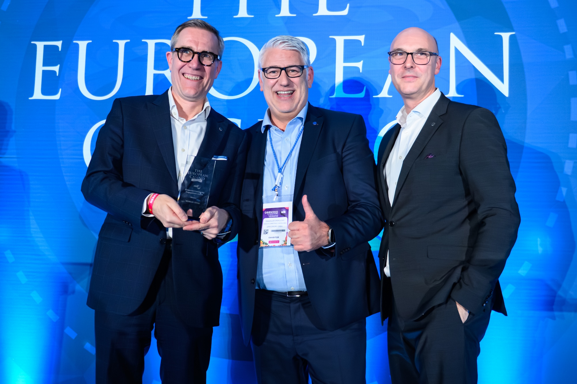 Dragoljub Grekulovic (Mitte), Head of Competence Center EMEA bei JCM Global, gratuliert Mario Hoffmeister (links), Leiter Zentralbereich Kommunikation der Merkur Group, und David Schnabel zum „Corporate Community Engagement Award“. (Foto: David Grau Llinares)