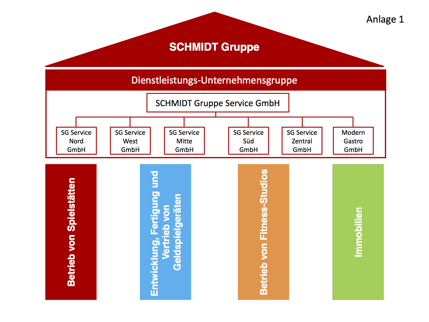 Die neu geschaffenen Organisationsstrukturen helfen, gleichartige und gleichwertige Service- und Dienstleistungen effizient für alle Geschäftsbereiche zu erbringen. Diese Aufgabe wird unter dem gemeinsamen Dach der neu gegründeten Dienstleistungs-Unternehmensgruppe (Schmidt Gruppe Service GmbH, Coesfeld) gebündelt. Tochterunternehmen sind zum Beispiel Service-Gesellschaften für den Spielstättenbereich, aber auch die SG Service Zentral GmbH, Coesfeld.
