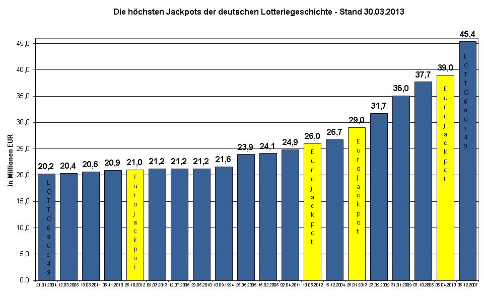 Das ist Rekord für das vor einem Jahr eingeführte Spiel. In Deutschland ist der aktuelle Eurojackpot nun schon der zweithöchste Jackpot, der jemals ausgespielt wurde. Lediglich im Dezember 2007 gab es mit 45,3 Millionen Euro einen höheren Betrag zu gewinnen.