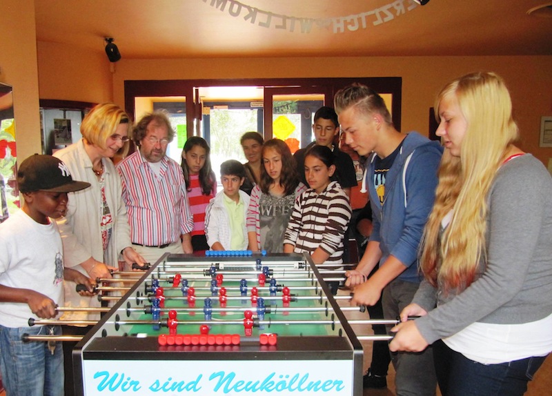Ungewöhnlich still war es dann im JUGI, als knapp 20 Kinder und Jugendliche auf die Enthüllung des neuen Tischkickers warteten und den Worten der Bezirksbürgermeisterin lauschten. Frau Schöttler lobte die tolle Initiative der Bally Wulff Stiftung, machte auf den hohen Nutzen von Spenden für soziale Einrichtungen aufmerksam und enthüllte schließlich, zur großen Begeisterung der Kinder, den Tischkicker, der dann auch gleich lautstark in Betrieb genommen wurde.